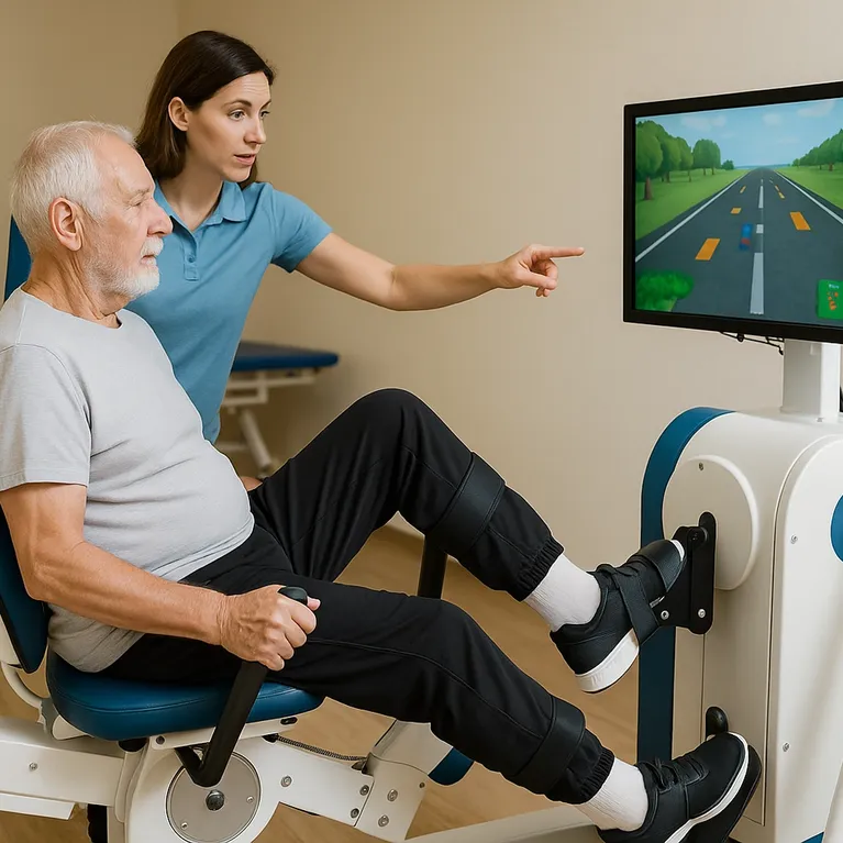• Training on specialised rehabilitation equipment with visual feedback. The patient performs simple tasks on a screen that guide repetitive, precise movements and make progress visible over time.